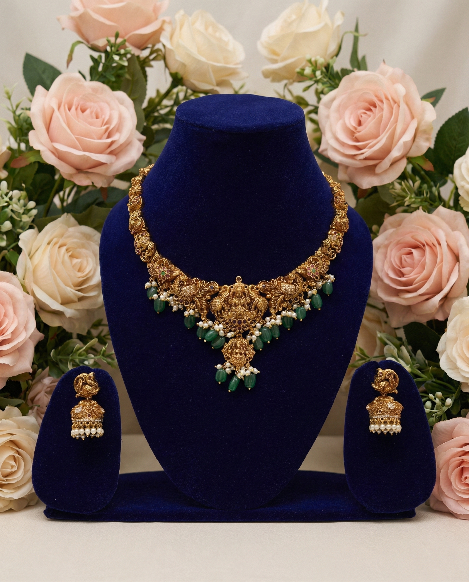 This is an antique-finish Lakshmi temple necklace set, featuring a divine Lakshmi pendant, intricate carvings, ruby-emerald stones, and green beads with pearl droplets
