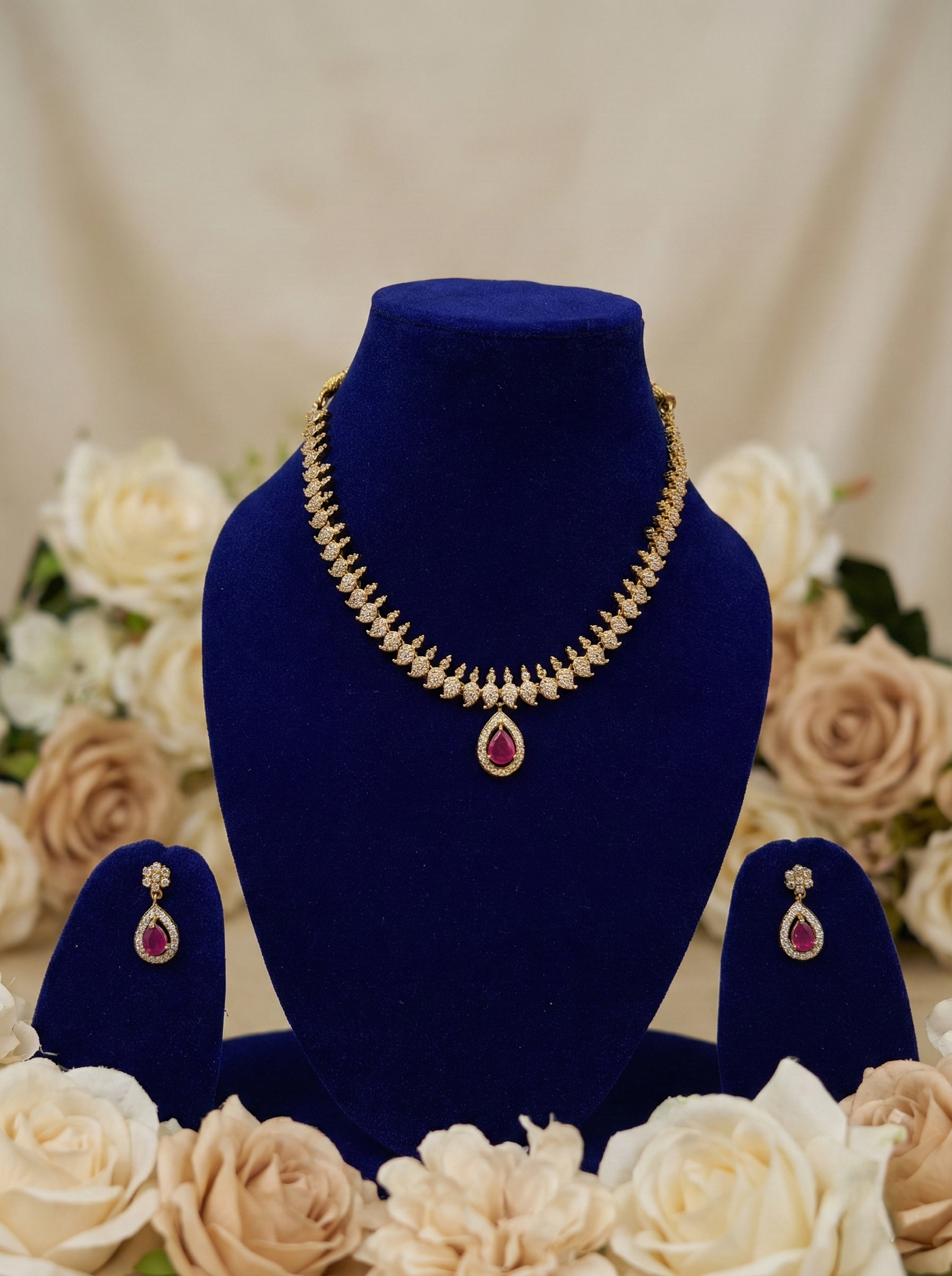 Each piece in the set is meticulously crafted with precision and care. The delicate platings ensures a luxurious look while highlighting the brilliance of the Imitation American Diamonds. The ruby-red teardrop motif stands out as a centerpiece, making the necklace and earrings undeniably eye-catching. Made with durable materials, this set promises to maintain its sparkling appeal over time, allowing you to cherish it for years to come.